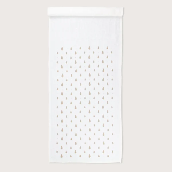 Many individual pine trees stand close together, with small scattered dots in between, all printed in warm gold. The pattern feels lively and festive, while the clear arrangement brings calm, and the golden accents radiate elegant, wintery magic.