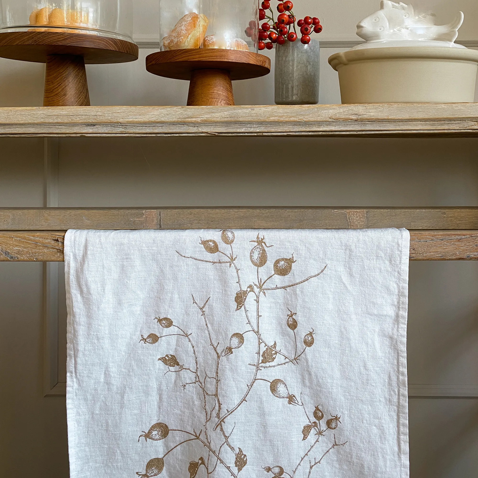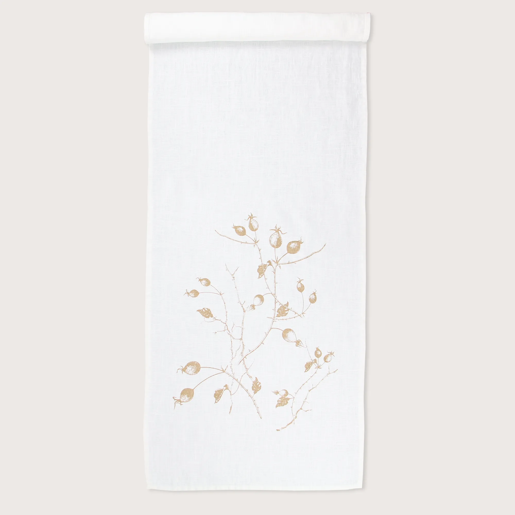 Delicate branches with finely drawn leaves and round rose hips form an elegant pattern. The warm gold tone gives the motif a festive, refined appearance and subtly highlights the natural grace of the rose hips in a tasteful, understated way.