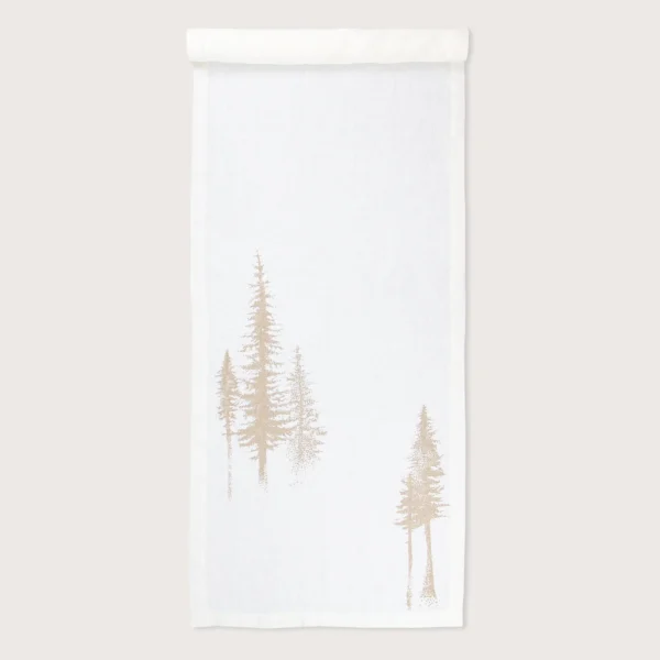 A forest of pine trees, printed in warm gold, freely arranged without a fixed pattern. The trees seem to float lightly, with space between them for light and quiet, giving the scene a dreamy and magical feel — a silent, sparkling winter forest full of elegance and mysterious atmosphere.