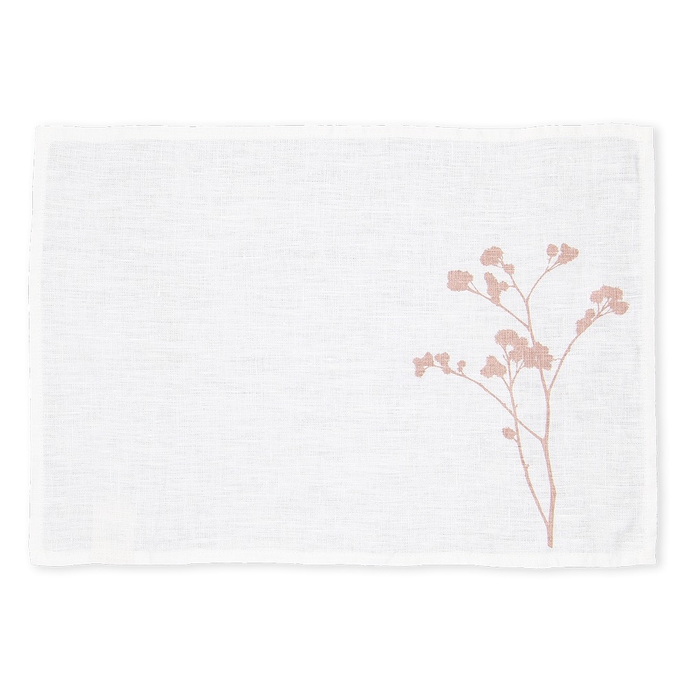 Placemat made of 100% linen, pre-washed, hand-printed with GOTS-certified inks. Decorated with a decorative wreath of leaves, branches or dried flowers.