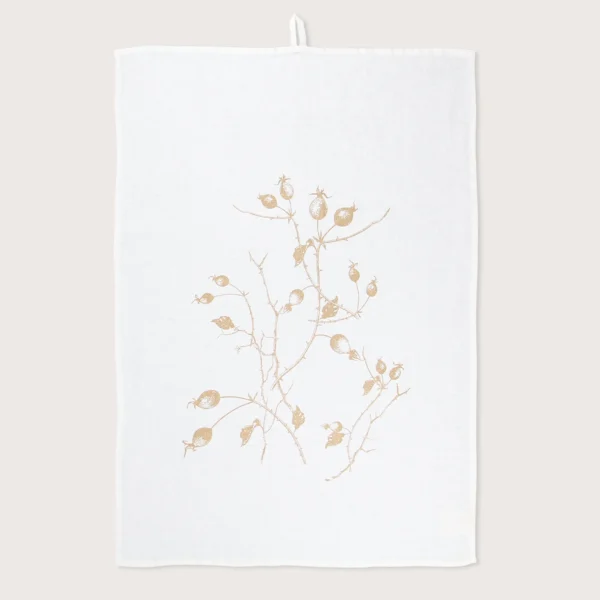 Delicate branches with finely drawn leaves and round rose hips form an elegant pattern. The warm golden hue gives the motif a festive, refined appearance, subtly highlighting the natural grace of the rose hips in a tasteful, understated way.