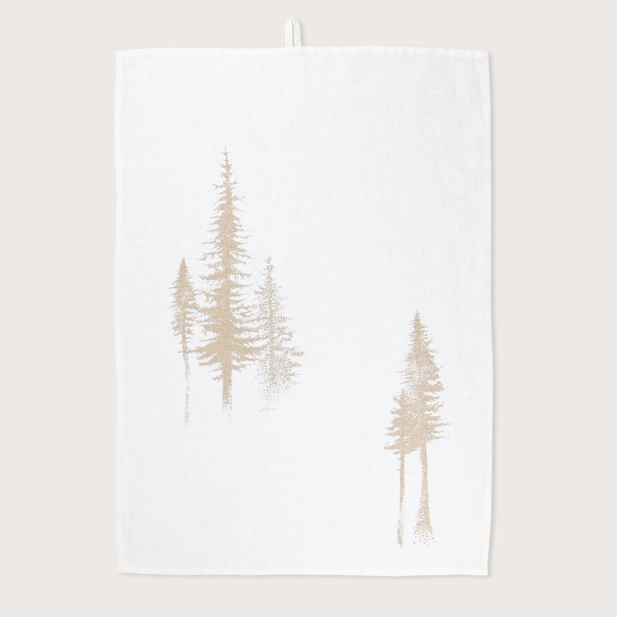 A forest of pine trees, printed in warm gold, freely arranged without a fixed pattern. The trees seem to float lightly, with space between them for light and quiet, giving the scene a dreamy and magical feel — a silent, sparkling winter forest full of elegance and mysterious atmosphere.