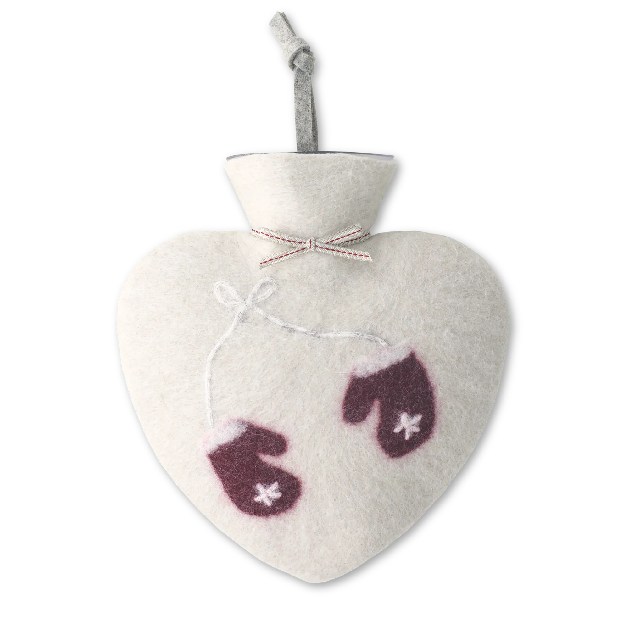 With adorable mittens dangling this heart warmer brings winter coziness into your home. The lovingly crafted felt appliqué tells stories of frosty walks and the comforting feeling of warm hands.