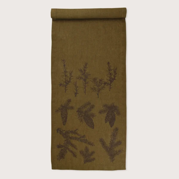 Feine Nadelzweige strecken sich locker über die Fläche, dazwischen liegen kleine Zapfen wie natürliche Akzente. Die lockere Anordnung wirkt leicht und luftig, erinnert an den Duft des Waldes und vermittelt eine schlichte, elegante Winterstimmung.