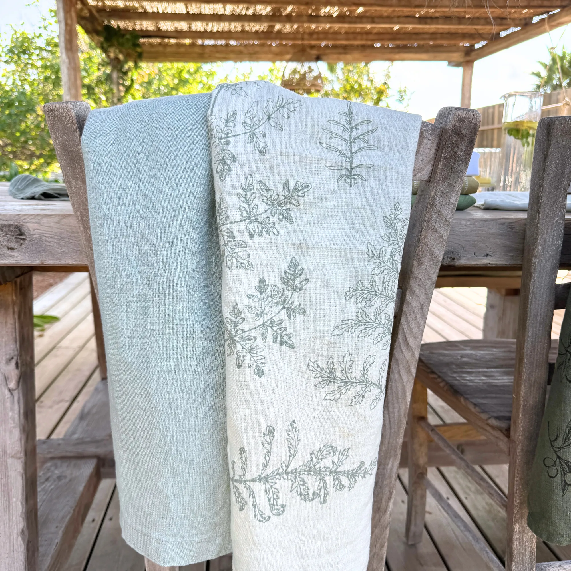 100% Handbedrucktes, vorgewaschenes Leinen, GOTS-zertifizierte Druckfarben, waschbar bei 40 Grad in der Waschmaschine.