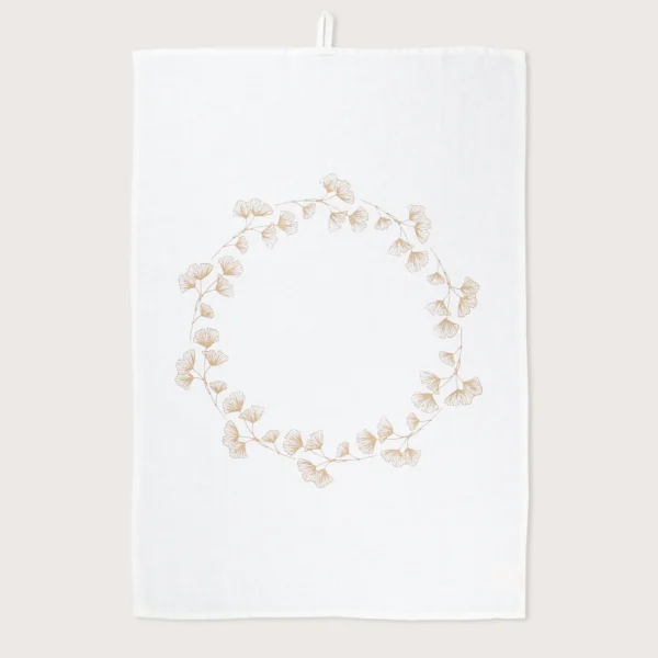 Ein Kranz aus goldenen Ginkgo-Blätter, die zarten, fächerförmigen Blätter schmiegen sich dicht aneinander und bilden einen eleganten Kreis. Ihr warmer Glanz fängt das Licht ein, als würde er der Herbst/Winter selbst still durch den Kranz wehen, friedlich und leuchtend zugleich.