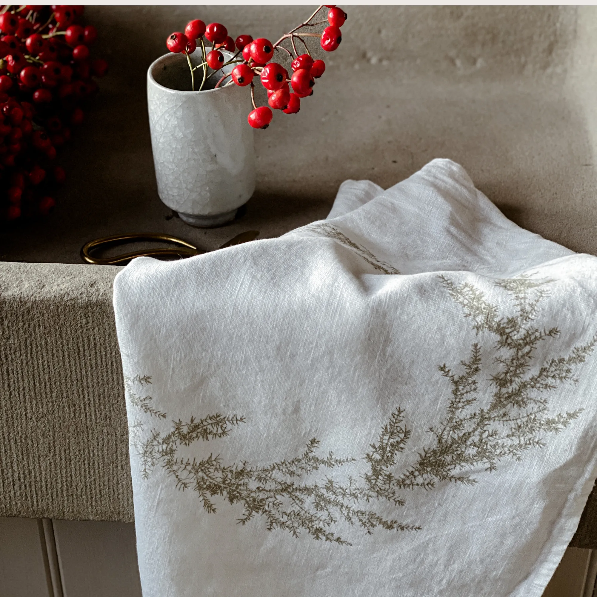 100% Handbedrucktes, vorgewaschenes Leinen, GOTS-zertifizierte Druckfarben, waschbar bei 60 Grad in der Waschmaschine.