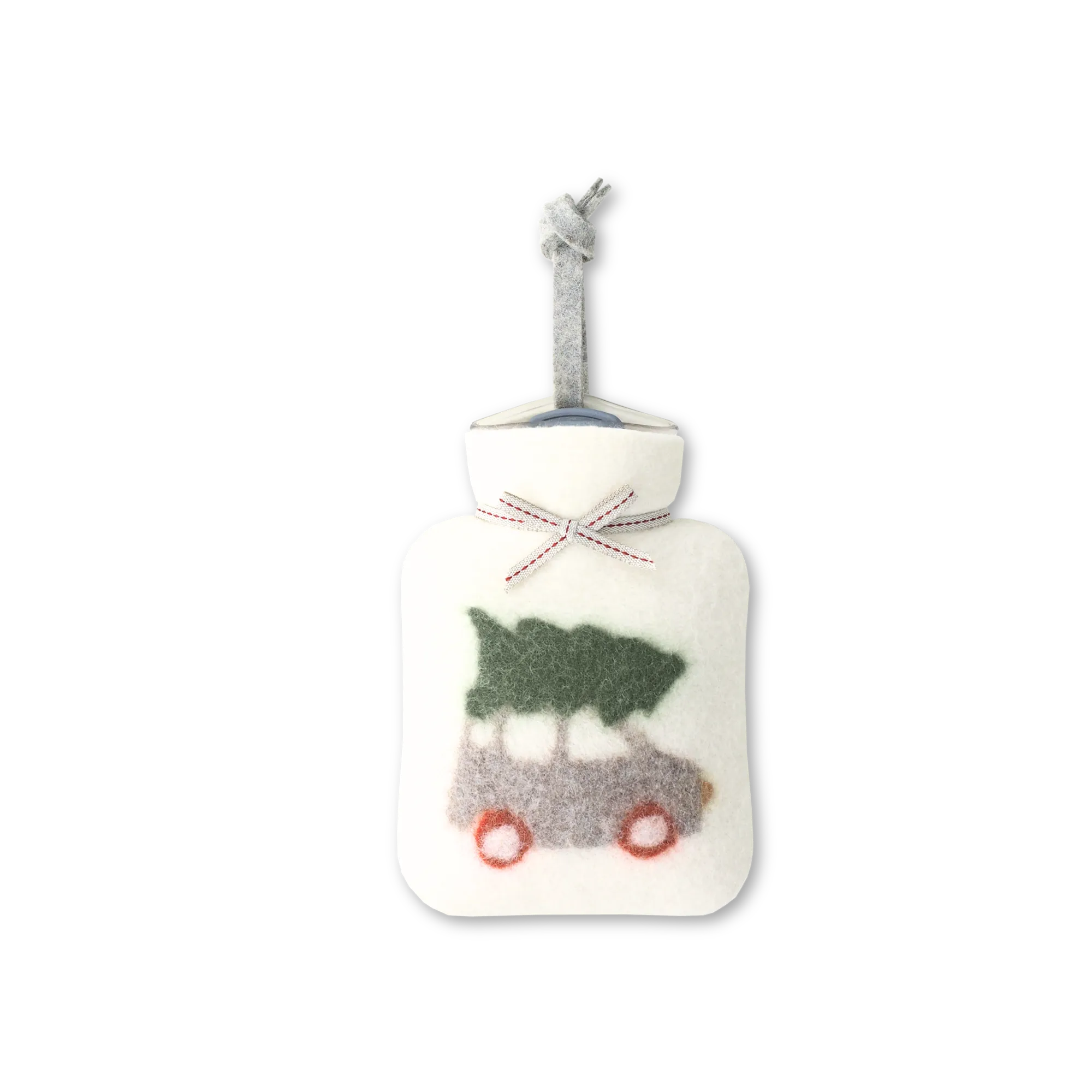 Durch verschneite Straßen fährt ein kleines rotes Auto, beladen mit dem schönsten aller Schätze – einem duftenden Tannenbaum voller Verheißungen.